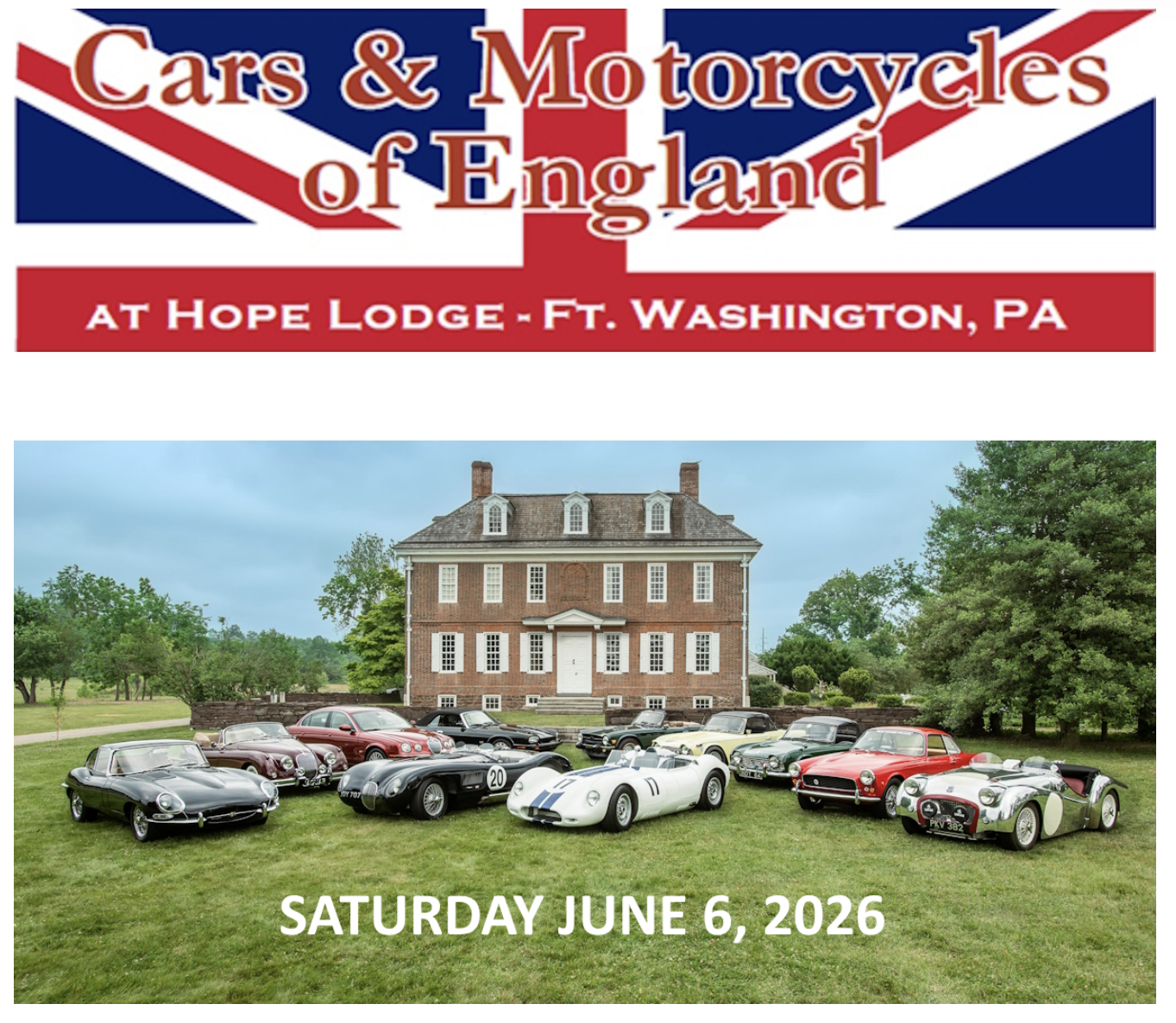 The Cars and Motorcycles of England at the historic Hope Lodge is back in 2026! The show features an all-British marque judged motorcar and motorcycle concours, and a nationally sanctioned Jaguar Concours d'Elegance. The combined show fields represent one of the largest British motoring shows on the East Coast with over 250 cars and motorcycles participating in each of the last four years in which this event was held. The show field opens at 8:30 AM and Judging begins at 10:00 AM. Prizes will be awarded beginning at 2:30PM.